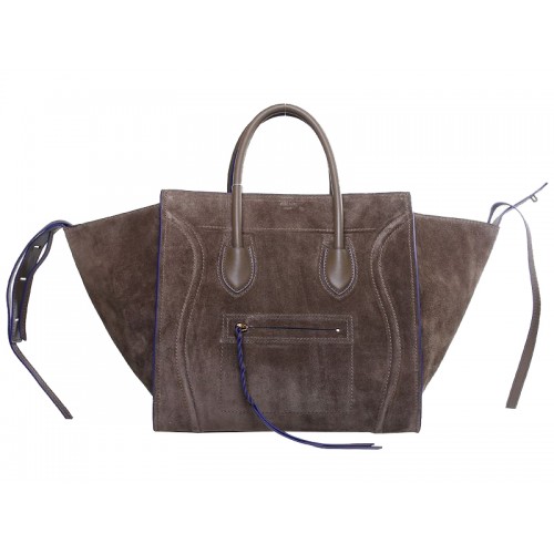 Celine Luggage Phantom Square Tote Bag aus Wildleder, Khaki mit blauen Akzenten