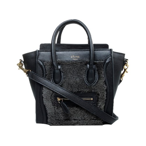Celine Luggage Mini Tote aus schwarzem Kalbsleder/schwarzer Wolle