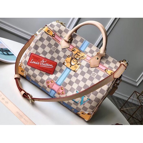 Dieser Speedy 30 besteht aus mit Damier Azur beschichtetem Canvas und Lederflicken, die mit Trompe-l'œil-Siebdrucken von Kofferraumecken und historischen LV-Schlössern verziert sind. Er ist die Essenz des LV-Stils. Für alle, die ihre modischen Referenzen zur Schau stellen möchten.
