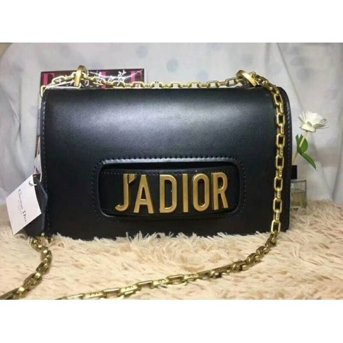 Klapptasche mit Schlitz und Handverschluss aus schwarzem Kalbsleder, J'Adior-Signatur und abnehmbarer Kordelzugkette aus gealtertem goldfarbenem Metall.