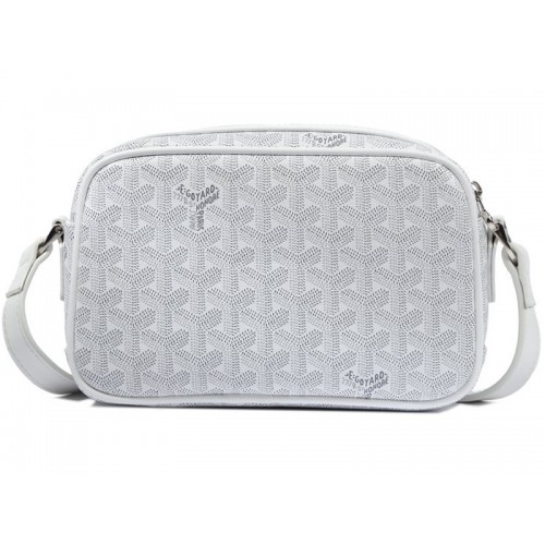 Diese stilvolle Hüfttasche ist aus klassischem Goyard Chevron Canvas in Weiß, Hellbraun und Schwarz gefertigt. Die Tasche verfügt über einen verstellbaren Taillengurt aus Leder mit silbernen Beschlägen und eine aufgesetzte Tasche mit Lederbesatz und Lederbesatz entlang der oberen Reißverschlussöffnung. Der silberne Reißverschluss öffnet sich zu einem zitronengelben Stoffinnenraum mit Platz für das Wesentliche für den Alltag mit der Tradition und Raffinesse nur von Goyard!