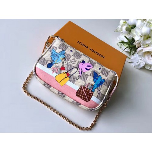 Inspiriert von den Louis Vuitton-Weihnachtsfenstern in den Galeries Lafayette in Paris sind die Mini Pochette Accessoires aus Damier Azur-Leinwand mit einem Druck fantasievoller spielender Vögel verziert. Dank seiner goldfarbenen Kette kann dieser schicke Beutel an einer anderen Tasche befestigt oder alleine getragen werden.
