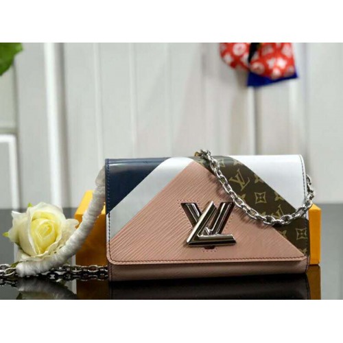 Die Twist-Ketten-Wallet erhält für die Twist Graphic Tape-Animation ein mutiges neues Aussehen. Dank einzigartiger Lederbearbeitungstechniken werden Blöcke aus farbigem Leder einem Monogramm-Musterband gegenübergestellt. Diese Brieftasche, die auch als kleine Umhängetasche getragen werden kann, verfügt über das emblematische LV-Drehschloss der Twist-Linie.