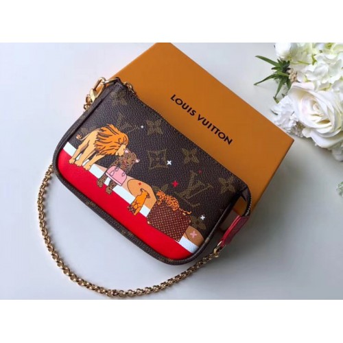 Um die Winterferien zu feiern, kreiert Louis Vuitton eine limitierte Auflage der Mini Pochette Accessories aus Monogram-Leinwand, überlagert mit einem Druck von Löwen, die mit ikonischen Hauskoffern spielen. Dieser verspielte und kompakte Beutel eignet sich als Tasche in einer Tasche oder als kleiner Handbeutel.