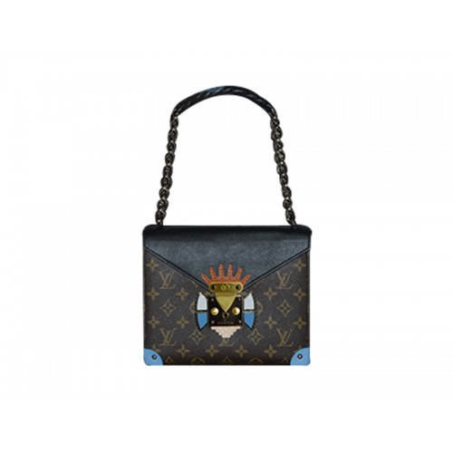 2015-Modenschau eine beeindruckende neue Taschenlinie vor. Inspiriert von Gaston Vuittons Sammlung afrikanischer Masken erinnern die einzigartigen Verschlüsse aus Metall und Emaille an stilisierte Stammesmotive. Die Pochette Mask GM kombiniert Monogram Canvas und Kalbsleder mit einem modischen Griff aus Kette und Leder, der für das Tragen über der Schulter konzipiert ist.