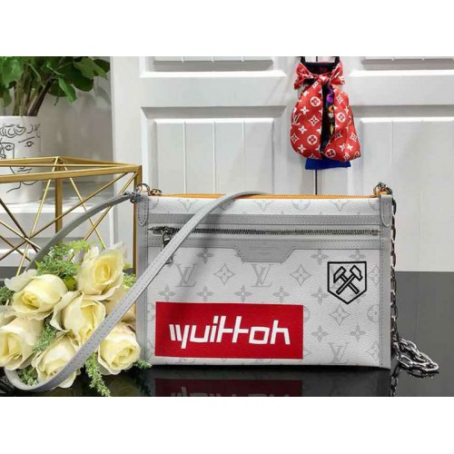Die moderne flache Messenger-Tasche besteht aus zwei separaten Beuteln mit Reißverschluss und ist ein funktionales Stück. Dank des schlanken Riemens kann es über der Schulter oder quer über dem Körper getragen werden. Ein seitlich angebrachter Karabinerhaken ermöglicht das Zusammenfügen der beiden Beutel oder das Tragen als individuelle Brieftasche. Das Monogram-Allover-Muster sorgt für ein raffiniertes Finish.