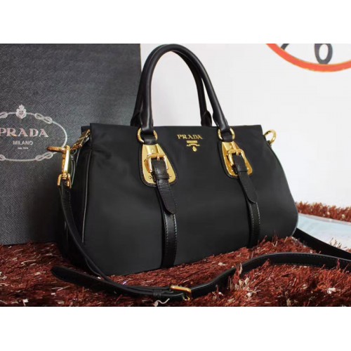 Prada Tessuto Nylon-Henkeltasche aus weichem Kalbsleder, Schwarz