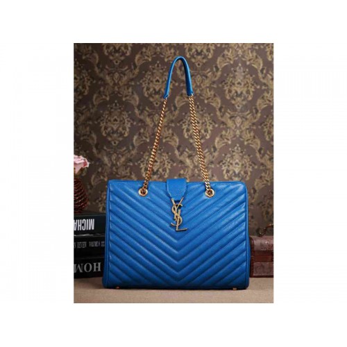 Yves Saint Laurent Classic Monogram Shopping Bag aus königsblauem, gestepptem Leder mit Grain-de-Poudre-Struktur.
